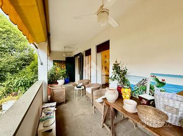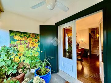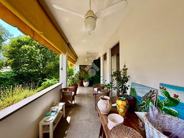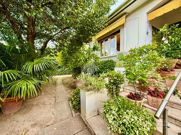 L'ingresso principale è caraterizzato da un terrazzo abitabile, coperto, rialzato rispetto al giardino, in corrispondenza dell'atrio, della sala da pranzo, della cucina e sicuramente ideale per pranzi e cene all'aperto con amici e familiari.