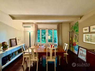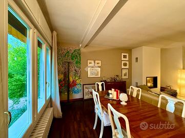 L'ampio salone, è diviso tra la zona divani e la zona conviviale con tavolo da pranzo, comodo per poter godere al meglio del verde del giardino di proprietà grazie alle grandi vetrate presenti.