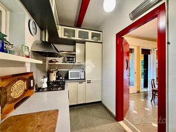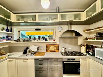 La cucina presenta una vetrata a ribalta elettrica, che permette di potersi dedicare all'arte culinaria e godere del verde esterno.