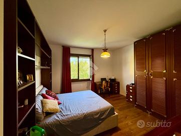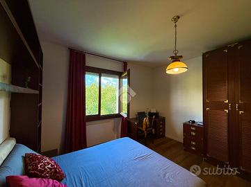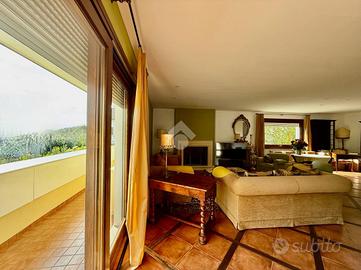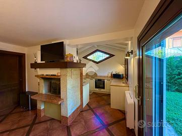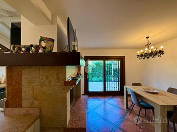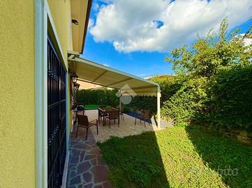Il p.t. è caratterizzato dalla presenza di un comodo salotto adibito a sala da pranzo, un salottino e una cucina abitabile con caminetto a legna e ulteriore tavolo da pranzo, oltre ad un ripostiglio, pratico anche come dispensa. La cucina e il salotto sono comunicanti direttamente col giardino dove troviamo uno spazio pavimentato con tenda da sole, ottimo per godere di pranzi e cene all'aperto. A completare il piano, bagno finestrato, stanza ad uso guardaroba, lavanderia e vano caldaia.
