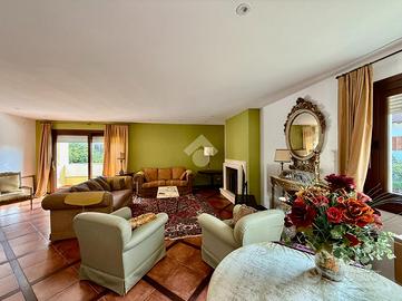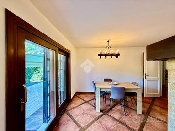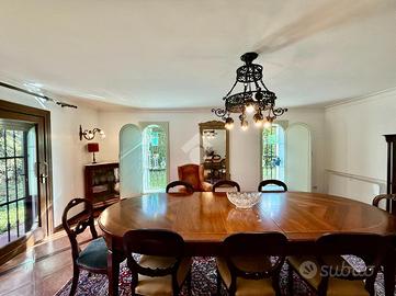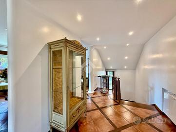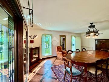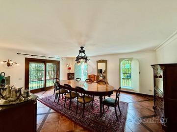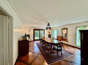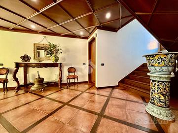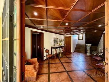 Vialetto in porfido ci accompagna all'entrata della villa, dove troviamo un portico d'ingresso, allestito a salottino esterno. L'ampio ingresso con soffitto in boiserie ci da' un'anteprima dell'immobile, in quanto fin da subito possiamo notare le generose metrature interne che la villa ci offre.