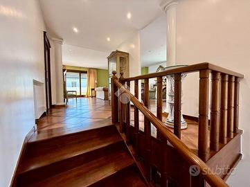 Frontalmente all'ingresso troviamo un'importante scala proporzionata alla grandezza dell'immobile, che ci accompagna al piano superiore, dove troviamo la zona living e zona notte. Il soggiorno spazioso di oltre 60 mq è contraddistinto dalla presenza di due divani e due sofà, oltre che di un tavolino e il caminetto. A completare la zona giorno, una stanza adibita a camera da letto, con possibilità di creare un secondo spazio cucina grazie alla presenza degli attacchi e un comodo poggiolo che conferisce una luminosità naturale agli ambienti. A sinistra della scala troviamo un disimpegno che ci accompagna alla zona notte, contraddistinta da tre camere matrimoniali e due bagni finestrati.