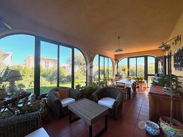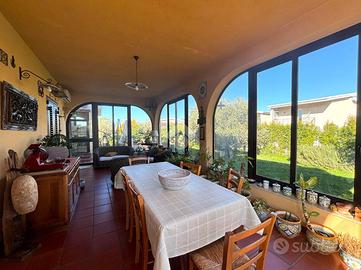 Si accede tramite un disimpegno che conduce ad una luminosa e ampia zona living-sala da pranzo, proseguendo verso una cucina abitabile con angolo cottura in muratura, comunicante con a una seconda sala da pranzo verandata, con vetrate che donano luce all'ambiente.