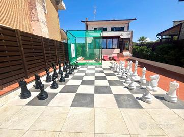 Dotato di due stufe a pellet, condizionatori zona giorno e zona notte, fibra ottica, infissi PVC doppio vetro, forno a legna, 2 docce esterne, vasca Jacuzzi, gazebo in legno, impianto fotovoltaico, allarme perimetrale, videosorveglianza, impianto domotico e tettoia in legno con area ping pong e scacchiera esterna a grandezza naturale.