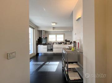 Il cambio di pavimentazione circoscrive la cucina, contemporanea e funzionale, collegata direttamente ad una grande terrazza coperta che può accogliere famiglia e amici in qualsiasi condizione meteo.