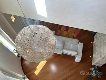 Il cuore della zona giorno è una grande apertura dall'alto dove scende un lampadario di design realizzato da Enzo Catellani, che illumina a 360 gradi sia il piano terra che il primo piano.