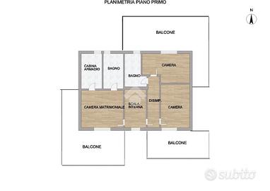 Al secondo piano, tre camere da letto, ciascuna con uscita su un ampio balcone, offrono spazi accoglienti e luminosi, completati da due bagni per garantire comfort e privacy.