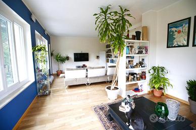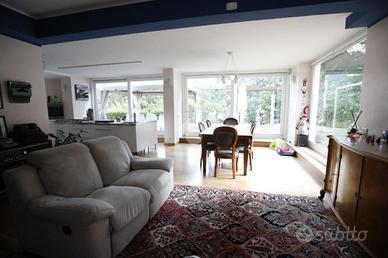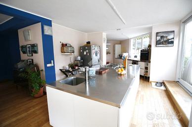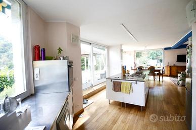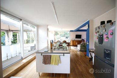 Al piano terra, l'ampia zona giorno accoglie cucina, sala da pranzo e soggiorno in un unico ambiente con ampie vetrate che rendono l'ambiente molto luminoso e con piacevole vista sul giardino, accompagnato da un maestoso bagno. Completano il piano terra, i pratici spazi di servizio che includono una cantina, un locale centrale termica e un locale lavanderia/stireria.