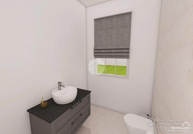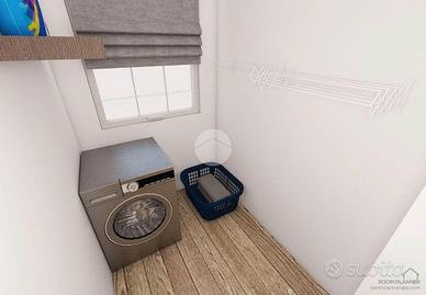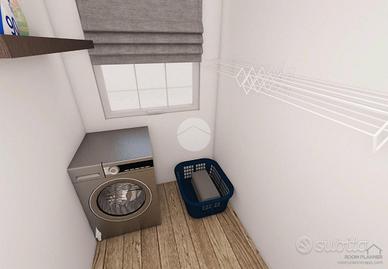Dal disimpegno si accede al ripostiglio con attacchi per lavatrice, al bagno finestrato ed al box doppio.