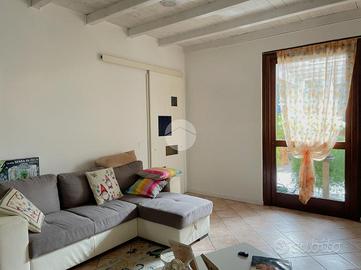 Al piano inferiore troviamo un'accogliente zona giorno, divisa in tre ambienti funzionali (cucina con area pranzo, salotto e studio), una camera matrimoniale, e due bagni di cui uno adibito a lavanderia.