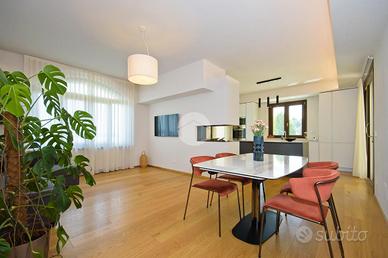 Nello specifico la villa comprende al piano terra un ampio quadrilocale con bagno oltre all'autorimessa doppia, mentre il piano primo, raggiungibile tramite scala interna, ospita cinque locali ben distribuiti ed i doppi servizi, con l'intero piano pavimentato in rovere italiano: la presenza di una scenografica zona giorno open space con caminetto a gas trifacciale e delle tre camere da letto al piano concede comfort e funzionalità per le esigenze abitative di ogni famiglia.
