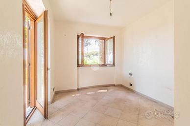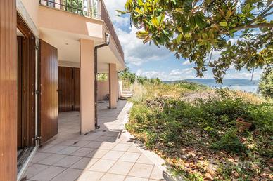 Al piano terra, l'ingresso si apre su un disimpegno che distribuisce gli ambienti: sulla destra troviamo una camera matrimoniale, sulla sinistra un bagno finestrato con vasca. Proseguendo si accede all'ampio soggiorno open space con camino centrale, caratterizzato da grande luminosità e accesso diretto al primo terrazzo di generosa metratura che affaccia sulla meravigliosa cornice del lago di Bracciano, perfetto per vivere l'esterno in ogni stagione. La cucina è posizionata sulla sinistra del soggiorno.