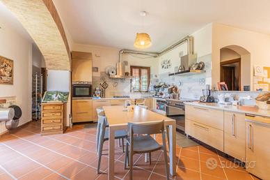 Il grande salone di rappresentanza, arricchito da un termocamino di ultima generazione, si apre verso la cucina con sala da pranzo, perfetta per ospitare momenti conviviali e ricevimenti esclusivi.