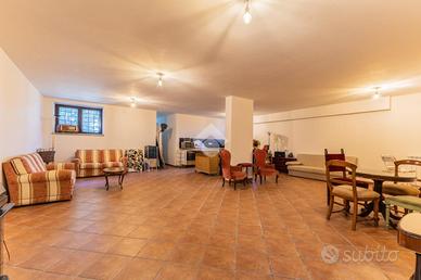 Al piano seminterrato si trova una zona giorno autonoma e funzionale, accompagnata da un box auto di 60 mq collegato direttamente al viale privato.