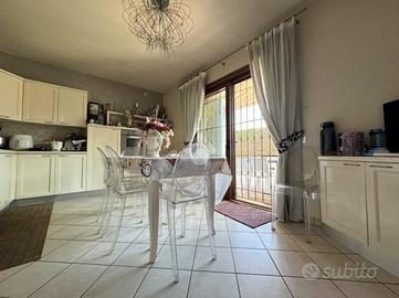 Entrando nell'immobile troviamo il soggiorno separato dalla cucina, entrambi con accesso diretto al giardino.