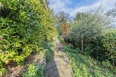 Esternamente, l'immobile è completamente circondato da un giardino curato e ricco di piante, che dona all'ambiente un'atmosfera serena e riservata.