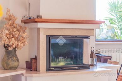 Una scala esterna conduce all'ingresso dell'abitazione, dove si apre la zona giorno composta da un ampio e luminoso soggiorno con termo camino e porta finestra che dà accesso al terrazzo, ideale per momenti di relax all'aperto.