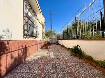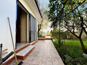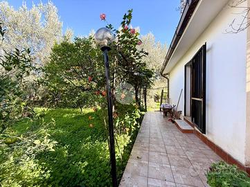 La villa è composta anche da un ampio giardino pianeggiante, sfruttabile in diversi modi. Salendo da una scala in muratura, si accede al terrazzo panoramico, un punto che offre un buon affaccio sul contesto circostante e una vista panoramica sul mare.