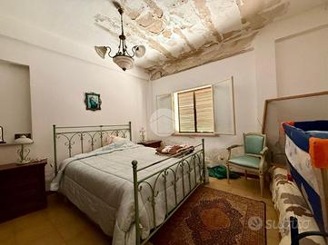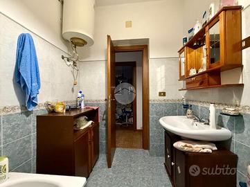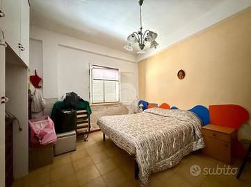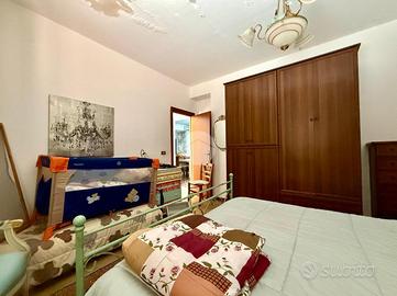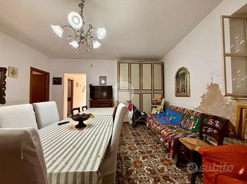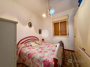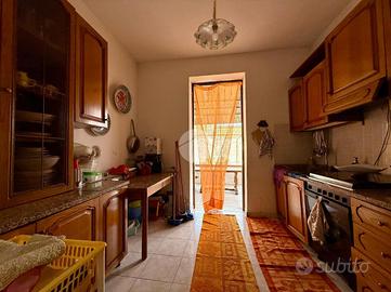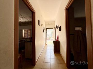 l'ingresso su un corridoio centrale che collega due camere da letto e il soggiorno. Dal soggiorno si accede a un'ulteriore camera e alla cucina, che dispone anche di una seconda uscita verso l'esterno. Sempre dal soggiorno parte un secondo corridoio che conduce al bagno con vasca e a un'altra camera da letto.