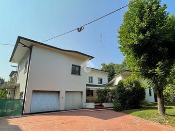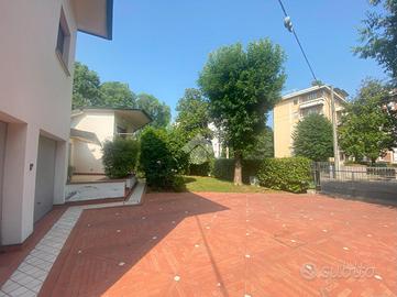 Il giardino perimetrale circonda la villa su tutti i lati, creando un ambiente riservato e ben curato. La proprietà dispone di ampi spazi per il parcheggio con possibilità di ricoverare fino a quattro veicoli, di cui due nel garage coperto.