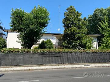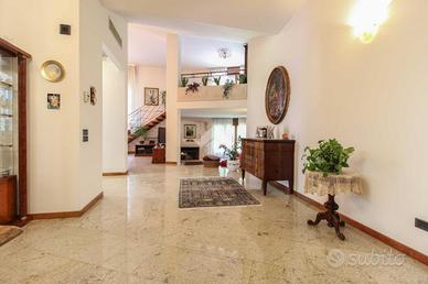 Il giardino perimetrale circonda la villa su tutti i lati, creando un ambiente riservato e ben curato. La proprietà dispone di ampi spazi per il parcheggio con possibilità di ricoverare fino a quattro veicoli, di cui due nel garage coperto.