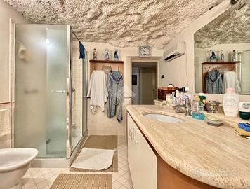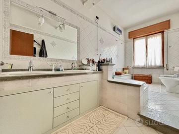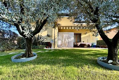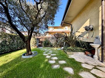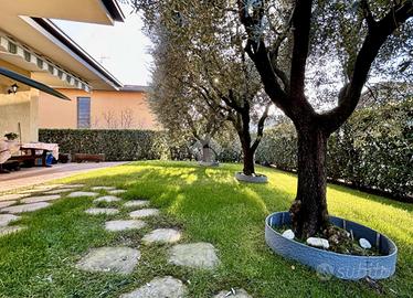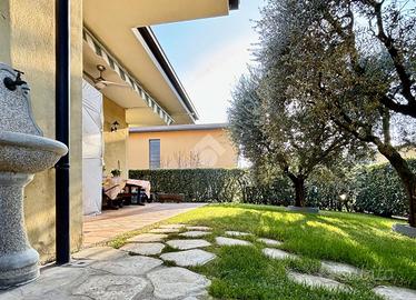 Il vialetto d'ingresso conduce all'ampio cortile esterno che circonda la casa, comprendente curato prato all'inglese con ulivi, area pavimentata destinata alla manovra ed al posteggio delle auto ed ampio porticato opportunamente riparato dal sole da una tenda elettrificata dove si fa spazio un comodo tavolo che può ospitare familiari e amici. L'imponente ingresso si apre nell'atrio che separa la zona giorno dal reparto notte. Il soggiorno è suddiviso in salotto con maestoso camino rifinito in legno e pietra, sala da pranzo e generosa cucina abitabile che si affacciano sul piacevole verde privato. Il reparto notte è ben separato dalla zona giorno attraverso una porta a vetri e ospita tre grandi camere matrimoniali, due delle quali dotate di aria condizionata, servite da bagno padronale con doppio lavabo e vasca idromassaggio interrata.