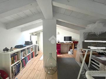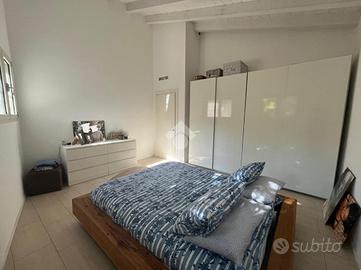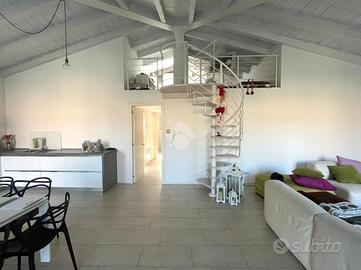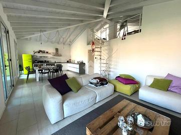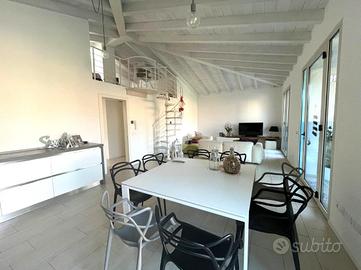 La zona giorno si struttura come open space con angolo cottura, una scala a chiocciola permette di accedere all'area soppalcata che si può adibire a studio o ulteriore zona relax.