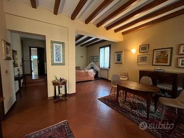 Dal grazioso portico, varcata la soglia d'ingresso, si viene accolti dall'ampio soggiorno con pavimento in cotto e travi in legno a vista, attigua la sala da pranzo collegata con il cucinotto, il quale accede direttamente al giardino.