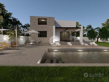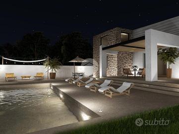 La villa si sviluppa su un unico livelo per una superficie complessiva di 100 metri quadrati più 30 metri quadri di sottotetto. All'interno, spazi luminosi e ben distribuiti accolgono una zona giorno con cucina a vista, due camere da letto e due bagni, pensati per garantire il massimo del comfort. L'architettura, in armonia con il paesaggio circostante, si apre verso l'esterno attraverso un elegante pergolato, ideale per godere dei tramonti estivi.