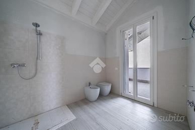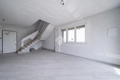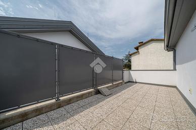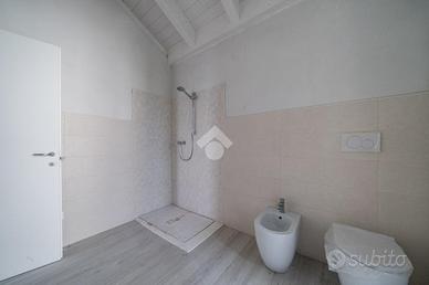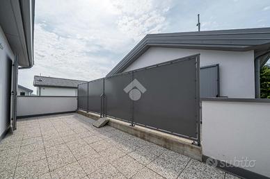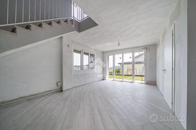 La soluzione si pone su due livelli quello inferiore è dedicato alla zona giorno con soggiorno avente cucina open space e uscita diretta sul giardino privato, a completare il piano è presente un bagno/lavanderia, una cantina, la centrale termica e un doppio garage. Il piano superiore è composto da 3 camere da letto aventi ciascuna il proprio terrazzo privato, completa il piano un bagno spazioso.