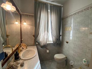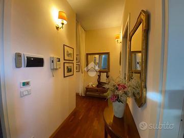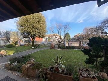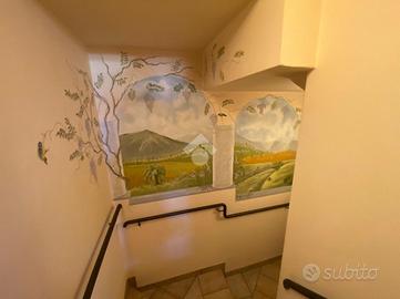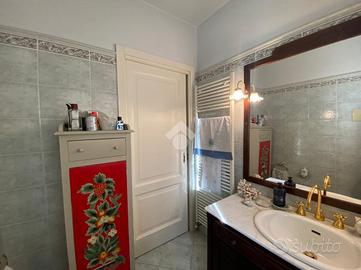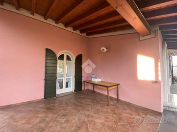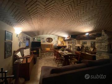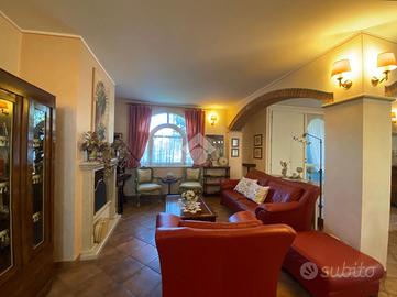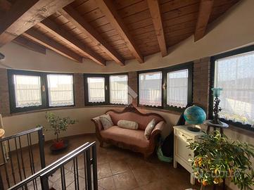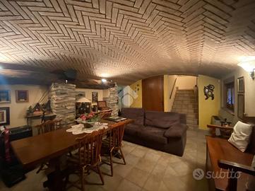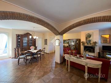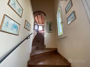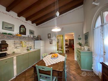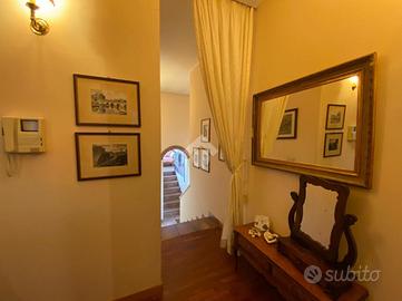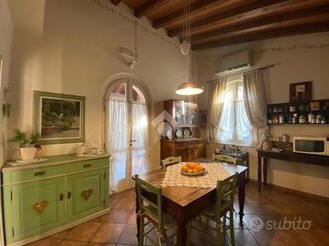 Al piano terra la proprietà presenta zona giorno con camino, cucina separata ed abitabile (che si affaccia sul vivibile portico) e bagno di servizio; al piano primo troviamo la zona notte, caratterizzata dalla pavimentazione in parquet, con tre camere da letto, doppi servizi ed ulteriore luminosa stanza, con travi a vista, che si presta ad essere adibita a studio.