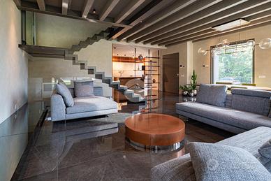 Piano primo - 36,5 mq: una scala di design autoportante a doppia rampa, con gradini solidi e ben strutturati separati da un vuoto centrale di circa 10 cm, valorizza la luminosità e la continuità visiva tra le rampe. La scala conduce a un ambiente soppalcato con travi a vista bianche, con altezza massima di 2,74 m e minima di 1,90 m, caratterizzato da un'atmosfera ariosa e moderna.