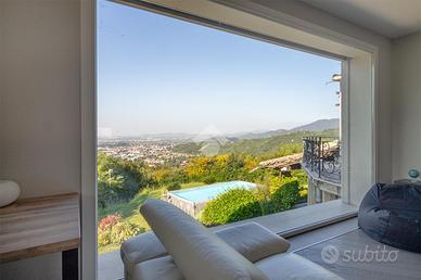 Nel cuore della rinomata località dei Campiani proponiamo in vendita questa proprietà dalle caratteristiche uniche. L'abitazione principale si sviluppa su due livelli per una superficie totale di circa 450mq. Un primo garage interrato, adiacente all'ingresso della villa, offre una superficie coperta di oltre 80mq. Una seconda unità è stata già integralmente rinnovata e rifinita con elementi di pregio, offrendo un assaggio dell'enorme potenziale della proprietà; la magnifica vista sulla pianura risulta splendidamente incorniciata dalla grande vetrata presente nella zona living. L'autorimessa fuori terra, della dimensione di 100mq, è stata attrezzata con un importante impianto fotovoltaico. La dimensione del lotto, oltre 16.000mq tra prato e bosco, offre il massimo della privacy e della tranquillità. La proprietà ha sviluppato nel dettaglio un progetto di ristrutturazione del corpo principale disponibile per essere visionato presso il nostro ufficio.