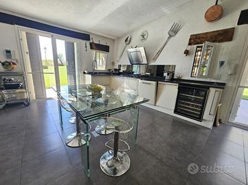 Salendo al piano superiore, troviamo un grande open space con cucina a vista, due ulteriori camere matrimoniali e un bagno. Da questo livello si accede direttamente a un magnifico giardino che ospita anche un campo da tennis e un'ampia taverna, perfetta per accogliere amici e familiari.