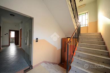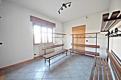 Scendendo le scale, si giunge al seminterrato, attualmente suddiviso in più spazi con pareti in cartongesso ed utilizzati, fino al trasferimento della proprietà e dell'attività precedente, in spogliatoio con doppi servizi muniti, ciascuno, di due docce.
