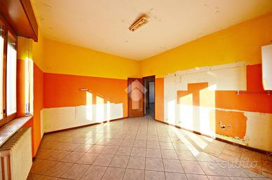 La proprietà si sviluppa su quattro livelli: il piano rialzato, attualmente accatastato come ufficio A10 e di c.ca 125 mq, è composto da quattro grandi locali oltre un quinto, adibito dagli ultimi residenti nella casa come cucina. L'ampio corridoio centrale conduce ai diversi spazi del piano, compreso un bagno fnestrato con vasca; dal locale utilizzato come cucina è possibile accedere all'area esterna di c.ca 460 mq, un giardino con alberi, alcuni di essi da frutto, e un ricovero attrezzi.