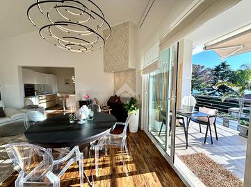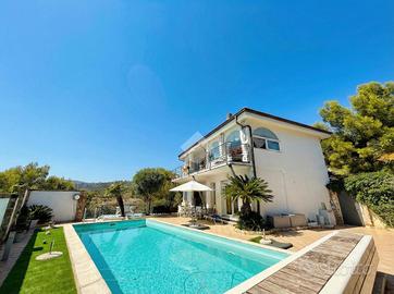 * Piano Terra: un ampio living con cucina all'americana e luminose vetrate sul giardino e sul mare, una camera matrimoniale con cabina armadi, due bagni, lavanderia e ripostiglio. Il portico si apre sulla splendida area relax con piscina scenografica (10x4 m, copertura automatica), zona solarium, idromassaggio e doccia esterna: un'oasi privata di benessere.