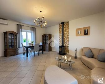 Una scala, con accesso sia interno che esterno, ci conduce al secondo appartamento situato al piano superiore composto dal soggiorno con stufa a legna e accesso sul balcone, dall' angolo cottura separato una camera padronale, due camerette e un bagno con vasca.