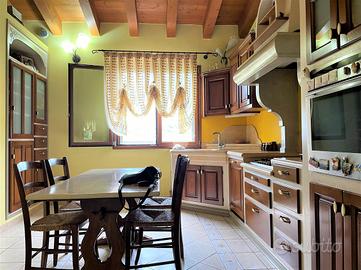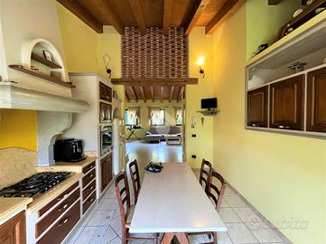 Salendo le scale interne troviamo una splendida terrazza travata a vista che precede la seconda porzione di immobile, completamente ristrutturata nel 1998 e suddivisa in ampio e luminoso soggiorno con cucina open-space, bagno con vasca e box doccia e due camere da letto matrimoniali di cui la padronale dotata di guardaroba e comodo terrazzo.