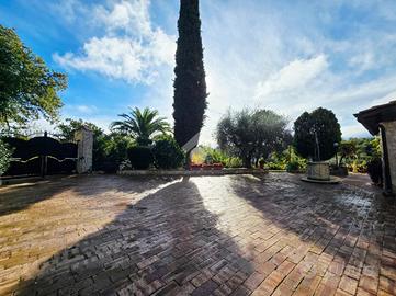 L'ingresso alla villa avviene attraverso un cancello automatizzato che introduce ad un'ampia corte pavimentata che garantisce diversi posti auto anche coperti grazie alla presenza di 2 portici e comodi spazi di manovra.