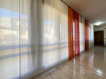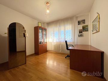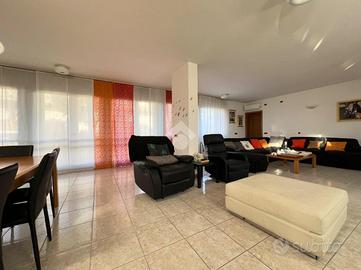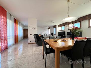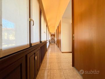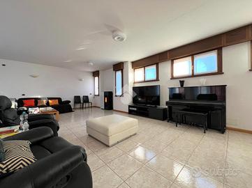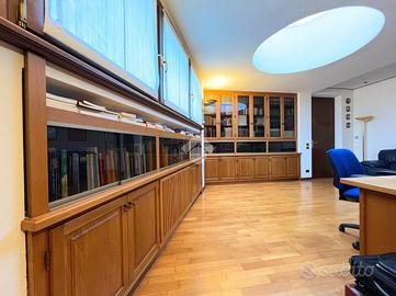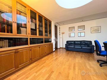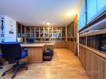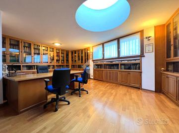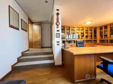 Al suo interno, un disimpegno separa l'ampio e luminoso soggiorno, caratterizzato da una parete vetrata che offre un affaccio panoramico, e la stufa a pellet, dalla cucina abitabile su misura, dotata di una pratica penisola. La cucina è collegata al soggiorno, che ospita anche una zona pranzo. Dal soggiorno si accede a uno studio, impreziosito da un lucernaio e dotato di ingresso indipendente. Sempre al piano terra, il disimpegno ospita un primo bagno di servizio finestrato.