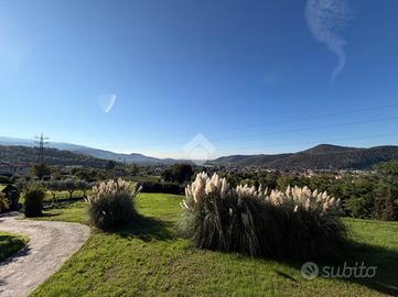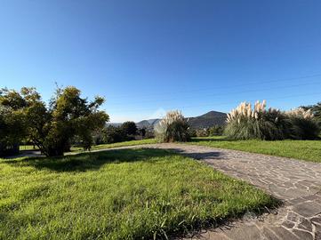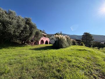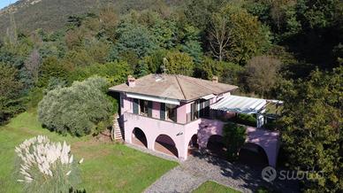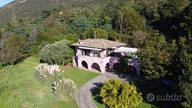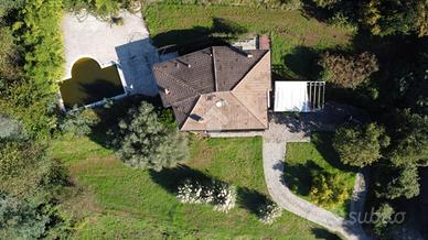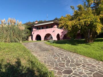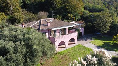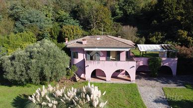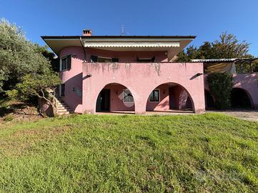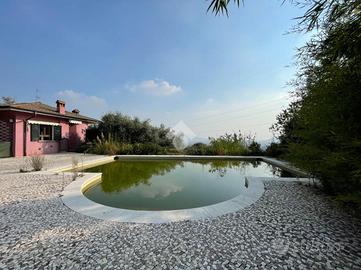 La villa è caratterizzata anche dalla presenza di una piscina, raggiungibile sia dal piano terra tramite una scalinata, sia dal primo piano, accedendovi dal giardino sul retro.