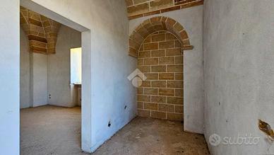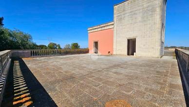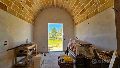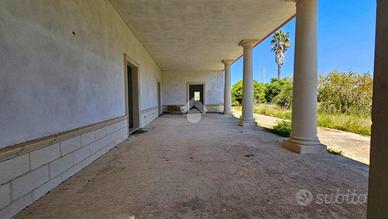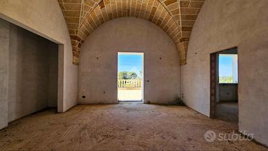 L'edificio principale si sviluppa su due livelli. Il piano terra, di circa 600 mq, colpisce per la scenografica presenza di un portico con colonne, tre ingressi distinti e ambienti caratterizzati da magnifiche volte a stella e a botte. L'organizzazione interna comprende numerosi ambienti tra cui soggiorno, sala da pranzo, cucina, vari disimpegni, sei servizi igienici, lavanderia, vani tecnici e sette camere da letto distribuite armoniosamente. Il primo piano, di circa 130 mq, ospita tre camere da letto con soffitti a volta, di cui una con balconcino privato, due bagni, terrazzo a livello e un disimpegno centrale che distribuisce gli ambienti.