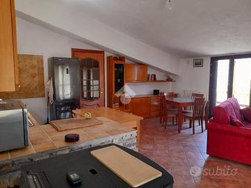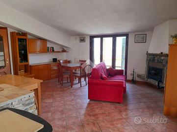 L' ingresso si ampre nell' ampio soggiorno con angolo cottura con penisola in pietra a vista, camino a legna e stufa idropellet per il riscaldamento e l' acqua calda.