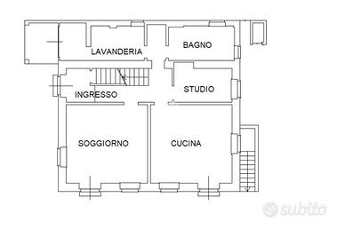 Il piano terra si compone di un'ingresso, un ampio soggiorno, una cucina abitabile, entrambi con uscita esterna sul cortile, un bagno finestrato, un locale adibito a lavanderia e uno studio.