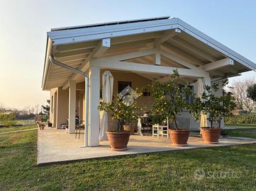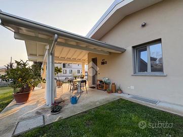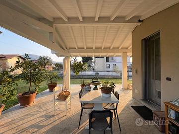 Questa residenza sorge su un lotto di circa 2000 mq, offrendo ampi spazi esterni verdi e comodo porticato con travi a vista sbiancate.