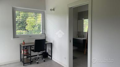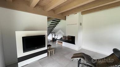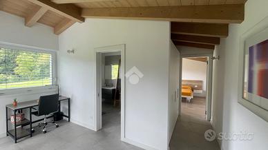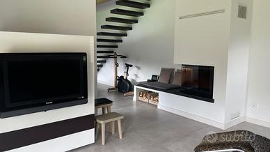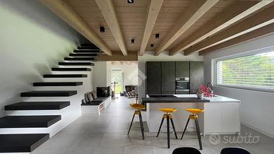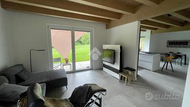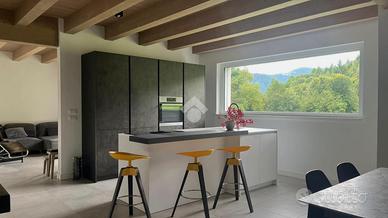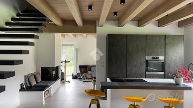 * ampio open space con zona living e cucina, arredi su misura e affaccio panoramico sul giardino