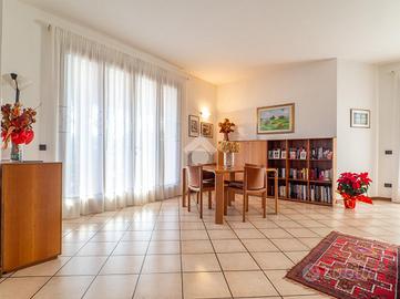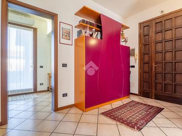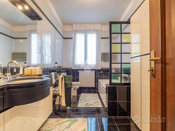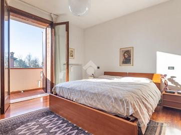 Prendendo le eleganti scale in legno, e separato da una raffinata porta a vetri che lascia filtrare la luce, si accede al grande disimpegno della zona notte, che ospita tre camere da letto e due grandi bagni finestrati: uno con doccia e uno con vasca idromassaggio. La camera padronale gode dell'accesso a un ampio balcone, mentre le altre due camere, oggi arredate come singole, offrono comunque metrature generose.