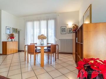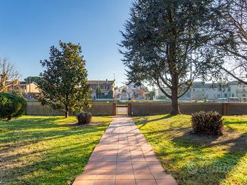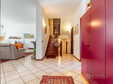 L'ingresso pedonale accompagna invece, attraverso una dolce scalinata esterna, al porticato e alla porta principale. All'interno si apre un ingresso elegante che conduce al grande e luminosissimo soggiorno, cuore della casa: due ampie vetrate lo mettono in diretto dialogo con il giardino, mentre gli spazi sono ben organizzati tra zona relax con camino in muratura e marmo e area pranzo affacciata sul verde.