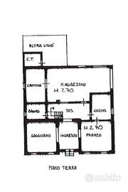 L'abitazione, al piano terra, è composta da un ampio ingresso che ci permette di raggiungere la zona giorno di circa 20mq, sala da pranzo anch'essa di circa 20mq e la cucina, proseguendo troviamo un bagno finestrato con doccia.